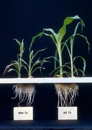 Symptomen van ijzer (Fe) gebrek beginnen op de jongere bladeren, plant vertoont chlorotische bladeren met strepen tussen de nerven. Als het gebrek ernstiger wordt verkleuren de nerven ook chlorotisch en ontstaat dwerggroei.