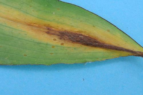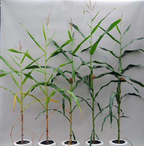Groei van de complete plant is geremd, bladeren en stengels vertonen chlorose. Oudere bladeren zijn het meest aangetast, ze worden geel en sterven vroegtijdig af. De stengelbasis vertoont een rode verkleuring. Ontwikkeling van kolven wordt verhinderd.