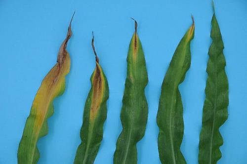 De bladeren kleuren gelijkmatig lichtgroen. De oudste bladeren aan de basis van de plant vertonen een geelverkleuring en vervolgens necrose startende bij de bladpunt.