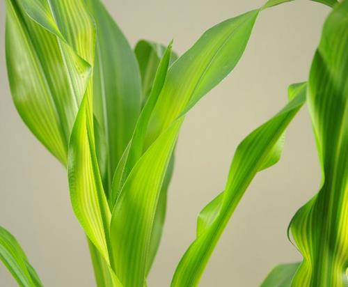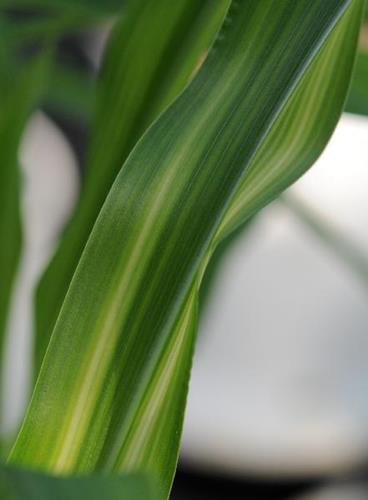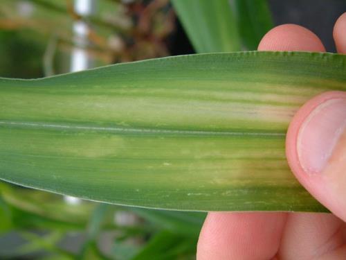 Bleke, geel-witte chlorotische zones lopen parallel met de hoofdnerf aan de basis van de bladeren wat resulteert in een streperige uitzicht.