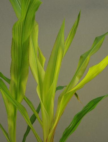 Planten vertonen een rechtop gerichte dwerggroei met tussennerfverkleuring van de jongste bladeren.