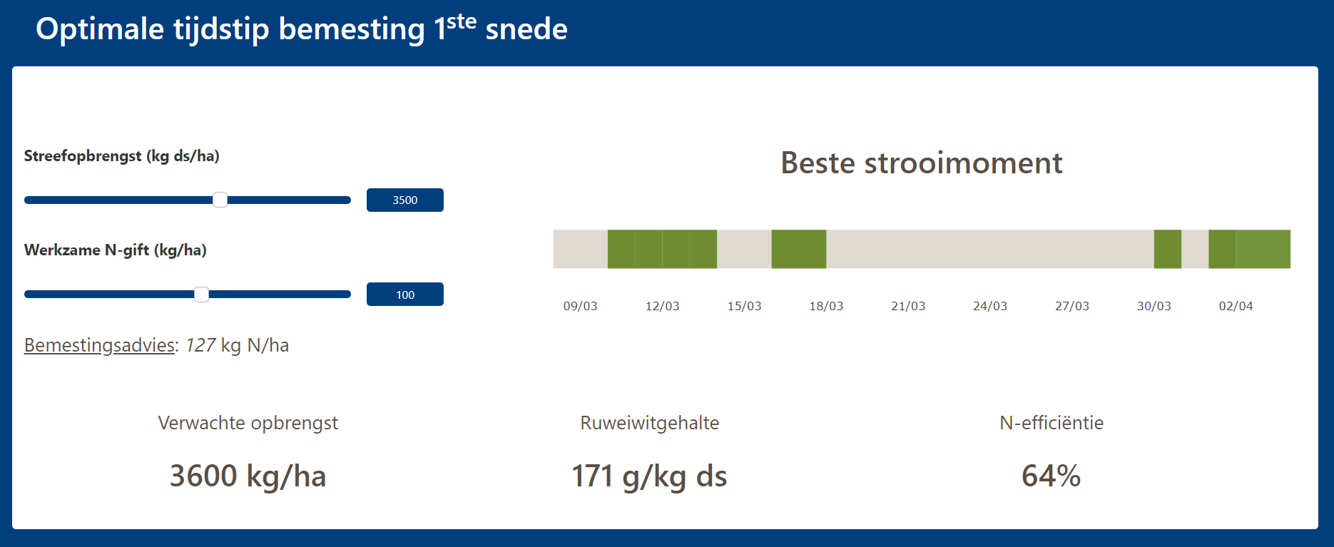 Of bij het bereiken van de optimale T-som voor een bepaalde streefopbrengst ook daadwerkelijk moet worden gestrooid, hangt af van de weersomstandigheden kort voor en na strooien. Voor het realiseren van een hoge N-benutting dient langer gewacht te worden met strooien, omdat daarmee het risico op N-verliezen in het vroege voorjaar verder beperkt worden. De YaraGrassN app 2.0 richt zich op het realiseren van een hoge N-benutting en daarmee op een goed RE-gehalte.
