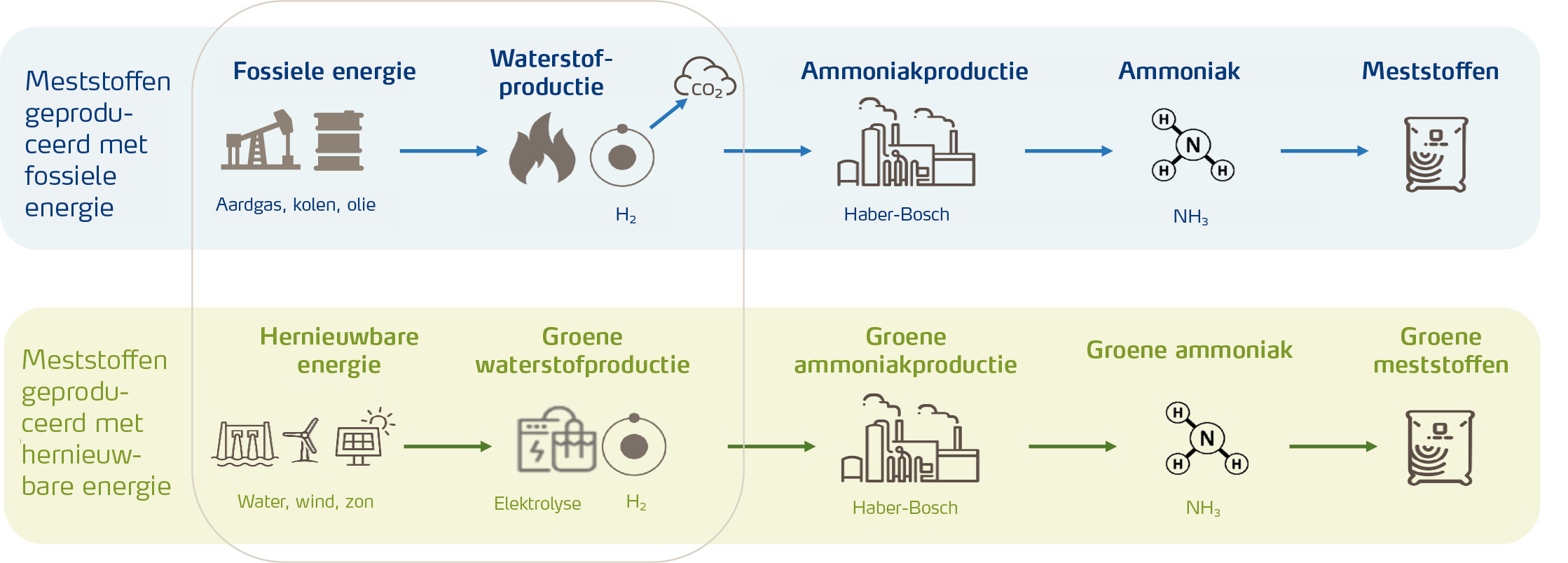 Ammoniak is de bouwsteen van alle minerale meststoffen. Tegenwoordig wordt ammoniak geproduceerd met behulp van waterstof uit fossiele bronnen. Om groene meststoffen te produceren zal de waterstof die nodig is om ammoniak te maken, afkomstig zijn van water door middel van elektrolyse op basis van hernieuwbare elektriciteit. Nadat de waterstof is gewonnen om groene ammoniak te creëren, blijven alle andere processen hetzelfde. Dit omvat het gebruik van een katalytisch proces met de beste beschikbare technologie (BBT) dat de uitstoot van broeikasgassen (BKG) tijdens de productie vermindert. De technologie heeft Yara in staat gesteld de uitstoot van stikstofoxide (N2O), een krachtig broeikasgas, bij de productie van kunstmest met ruim 90 procent te verminderen.