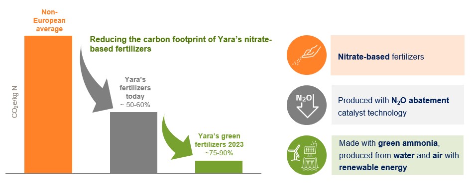 Tegenwoordig hebben de op nitraat gebaseerde minerale meststoffen van Yara, geproduceerd in de Europese Unie en Noorwegen, al een CO2-voetafdruk die ongeveer 50 tot 60 procent lager is vergeleken met de meeste meststoffen van buiten de EU, dankzij het gebruik van een katalytisch proces met de beste beschikbare technologie (BAT).Dit is eerst ontwikkeld door Yara en later gedeeld met andere producenten. Het gebruik van hernieuwbare elektriciteit voor de productie van groene meststoffen op basis van nitraat zal de ecologische voetafdruk met nog eens 75 tot 90 procent verkleinen.